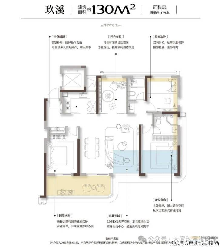 建面约130㎡「玖溪」四室两厅两卫,南北通透全明格局,搭配可开合灵动空间,完美适配多孩家庭与三代同堂的多元居住需求。