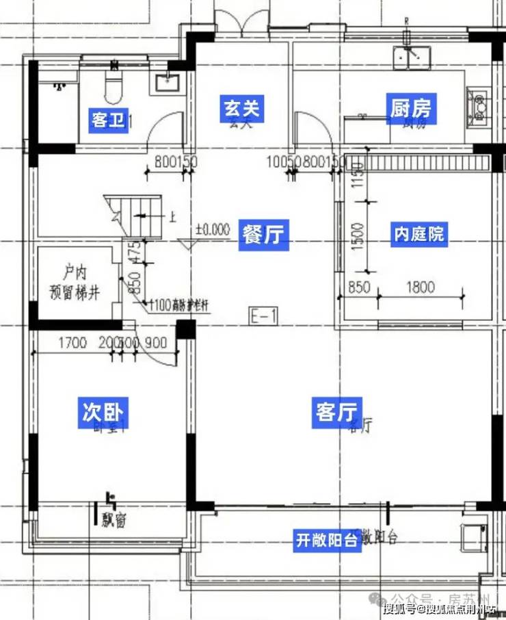 这个户型相对小一点,以东西边户为例,一层配置餐客厅、厨房、次卫、次卧以及内庭院等。