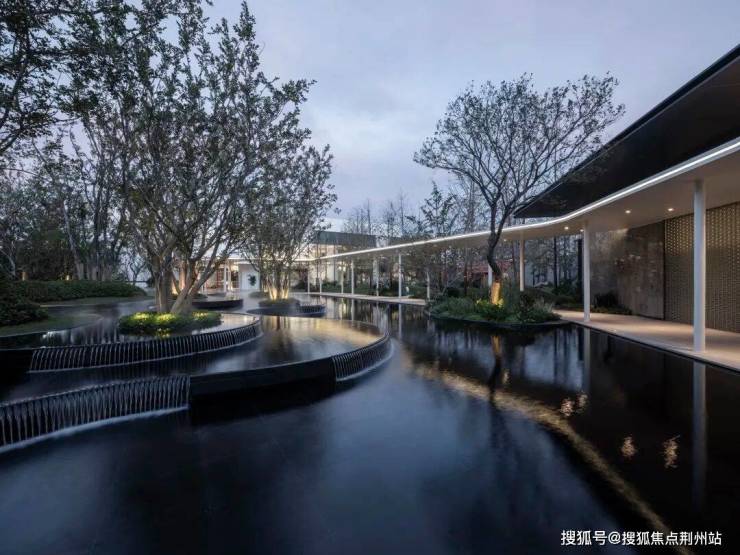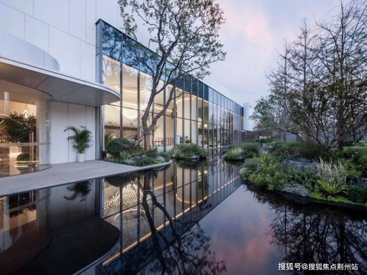 轻薄的风雨连廊串联起酒店式大门与未来的会所,池水在阳光下晶莹剔透,泛起的秀色,映出一片明净。水景跌落的轻语,树梢轻微的摇曳,更像轻风送来的怡然安宁。