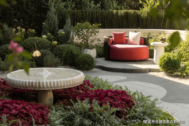 铺装与绿化的交界经精细化处理:平台边缘抬高150mm,形成悬浮于绿意之上的轻盈感;同时,向绿植内嵌50宽石材窄带,以理性的线条分割自然的生长,从而丰富景观层次。