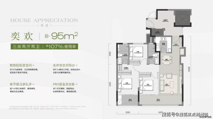 该户型带独立电梯前室,南向双阳台,据户型图宣传,优化后约107%使用率;主卧空间阔绰,餐厅带S墙设计。户型南北进深比常规中间户要大,因此得房率会更高,户型结构是相对常规的中间户。
