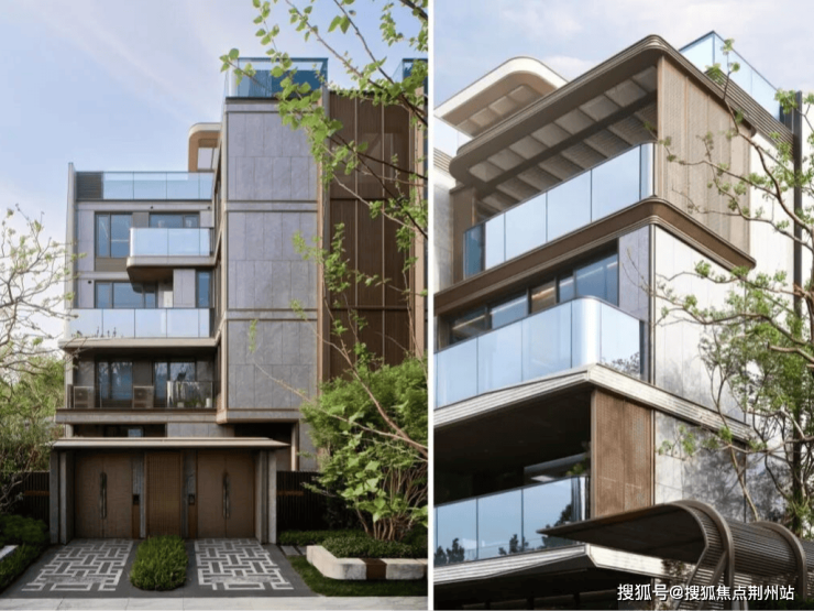 在立面的构成中,我们能看到现代主义几何美学的理性克制,也能发现东方建筑中借景、框景的灵动智慧。石材的厚重与玻璃的轻盈对话,混凝土的质朴与金属的精致交织,竖向线条的挺拔与横向延展的舒展共鸣。这些元素共同构成了叠墅立面特有的“层叠美学”。