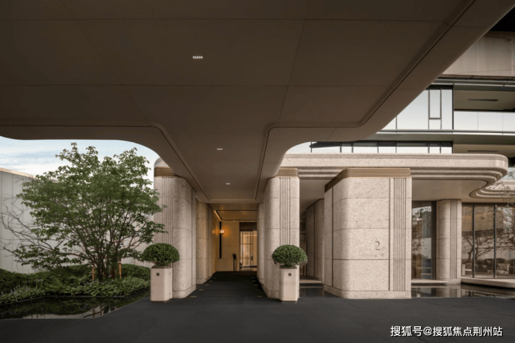 社区门头:立面设计更是将工艺美学与生活体验完美结合。内外双重门厅景墙运用了曲面月光米黄石层叠设计,层间搭配香槟金不锈钢,打造自然、峡谷意境,曲面不仅复刻钱塘江潮起潮落的流畅动感,更能在不同光线下呈现温润细腻的质感,让建筑随着日光变化展现不同美感。
