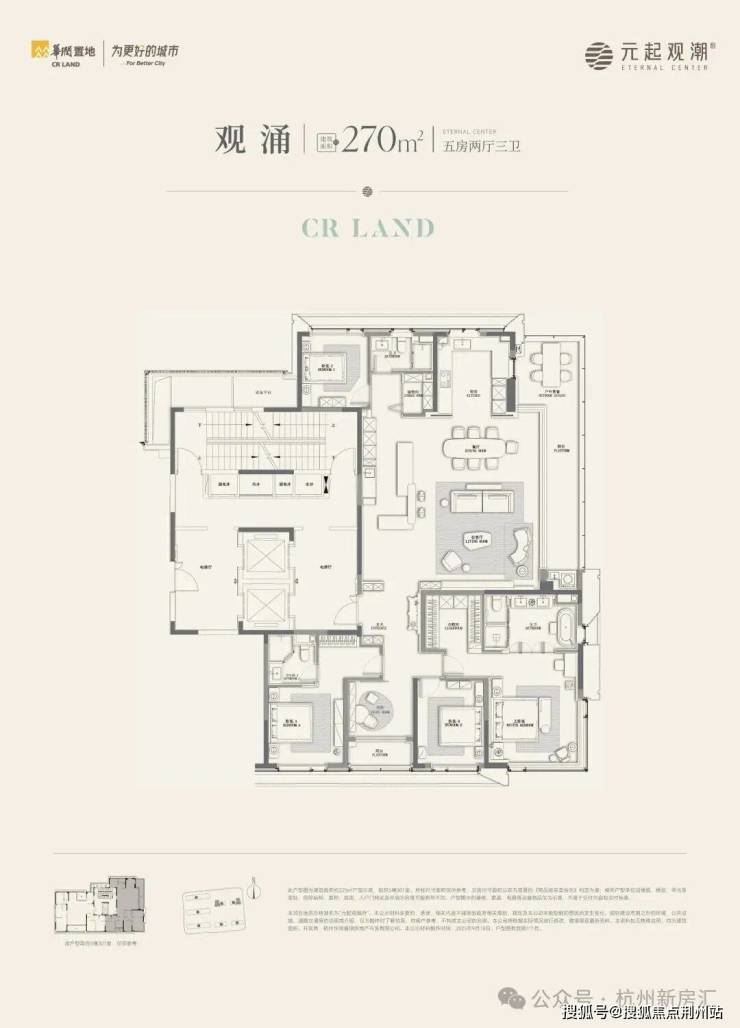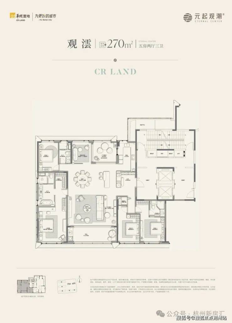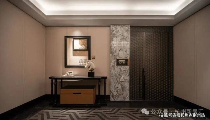 建面约270㎡五房 南厅户型:有边厅和南厅两款:两梯两户+双开门贯通电梯,实际使用起来有近似“两梯一户”居住体验。巨大的电梯厅面积将近13㎡,精装奢石和木纹铝板。从尺度到装标,都冠绝杭州住宅领域。