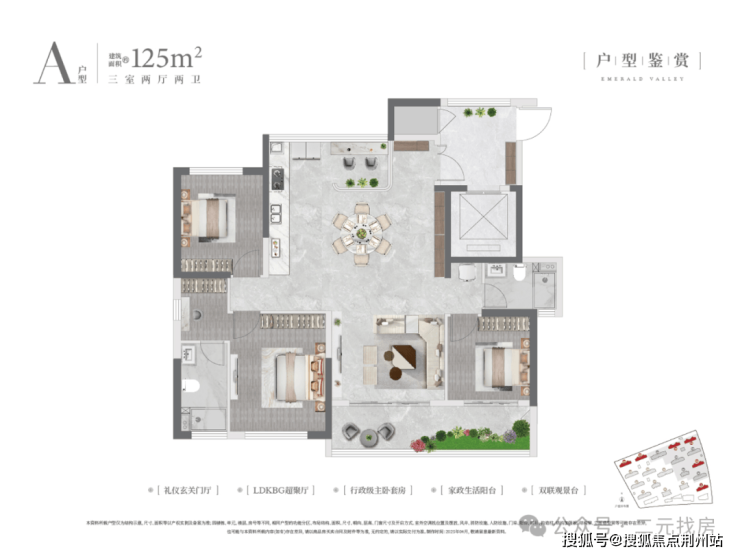 这个125㎡户型,做的还是三房两卫,但从外立面上看没有错层的露台。