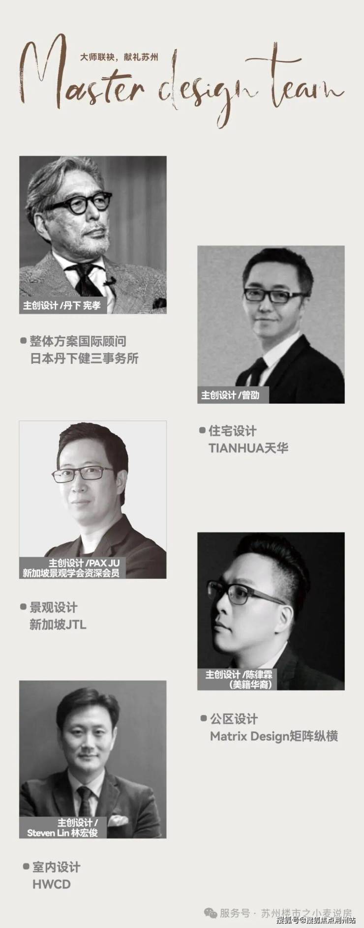 大师联袂 献礼苏州整体方案国际顾问 ,日本丹下健三事务所住宅国内方案设计 。TIANHUA天华整体景观方案设计 ,新加坡JTL住宅公区设计, Matrix Design矩阵纵横室内户型设计HWCD