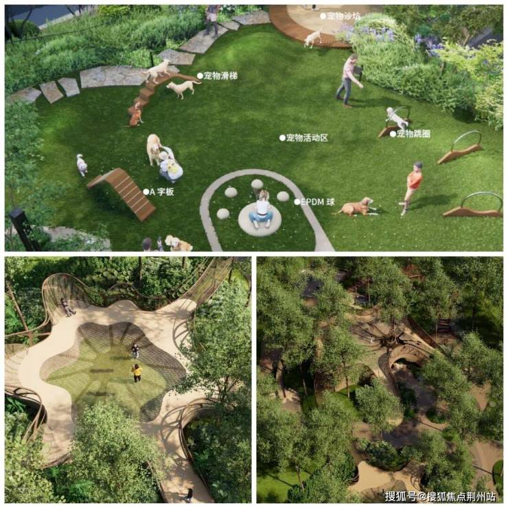 也有分龄段无动力设施的儿童乐园、宠物自由奔跑的毛孩子乐园,满足家庭日常遛娃遛宠;
