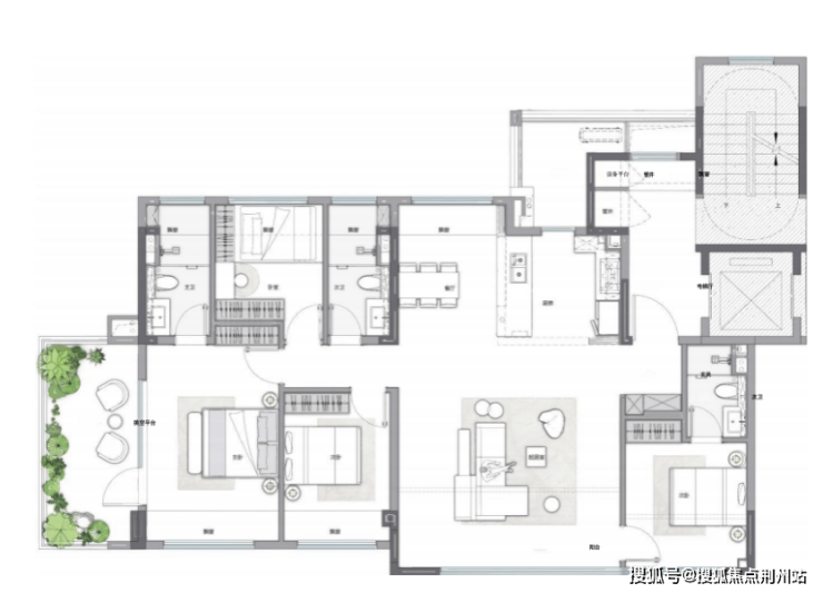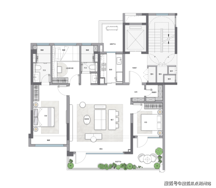 建面约120㎡户型(偶数层),约6米方正大横厅,双阳台+360°L型露台超配组合,主卧套房步入式衣柜,每一步的尺度,都很惊人。而且,该户型北向还有一个设备平台,功能性十足。