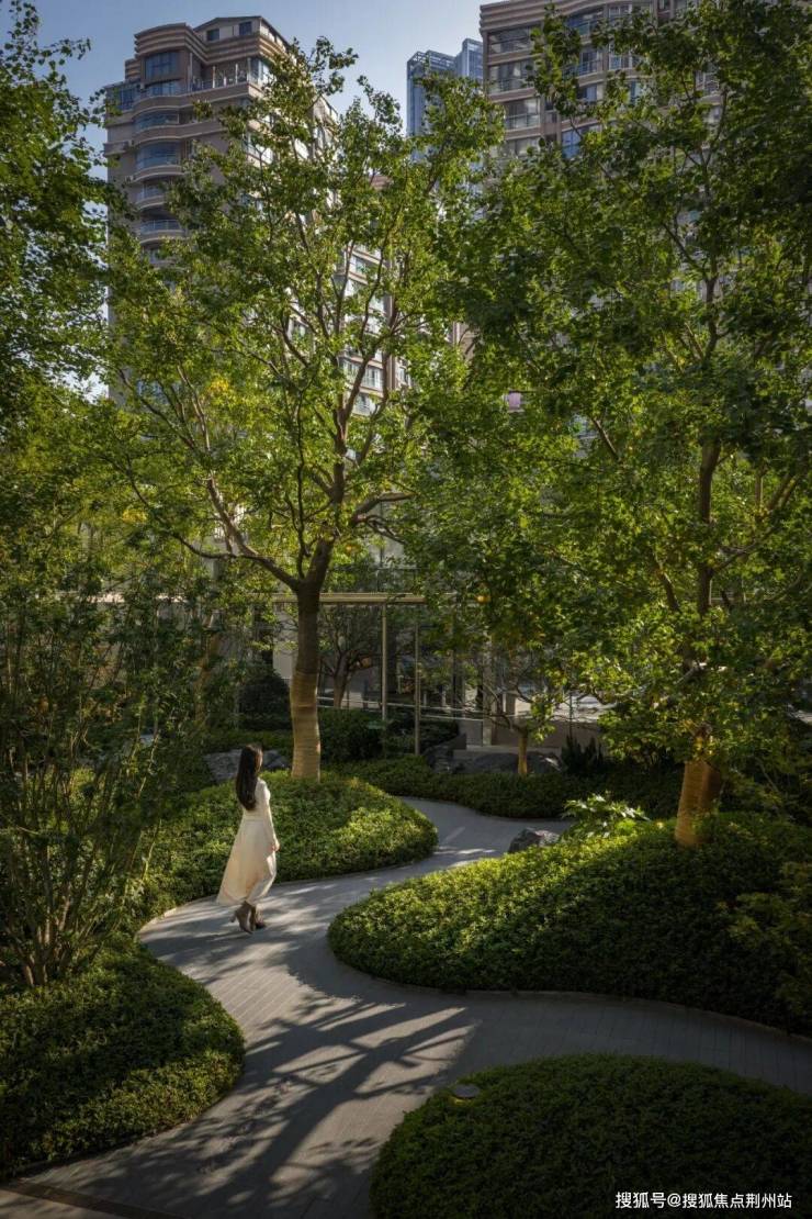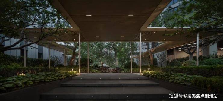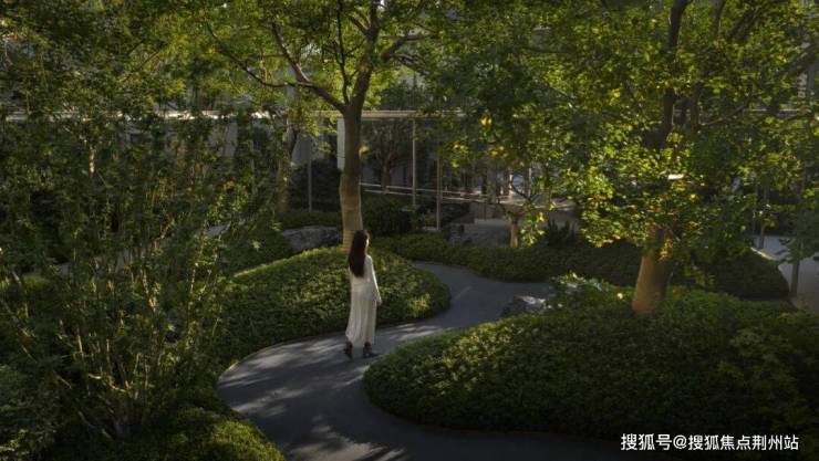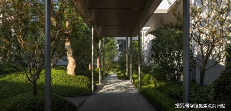 穿过门楼后,入口处以框景的形式再现森林画卷,曲廊串联起光影与绿意,让日常通行成为诗意穿行,雨天不湿鞋,晴日纳微风,晴雨皆从容。香槟金色廊身彰显空间轻奢感,细结构廊柱给予空间渗透,亦延续林境氛围,人行其间,一步一景,归家之路由此开启一场与自然的对话,曲径通幽处,绿意层层叠入,营造静谧归家仪式。