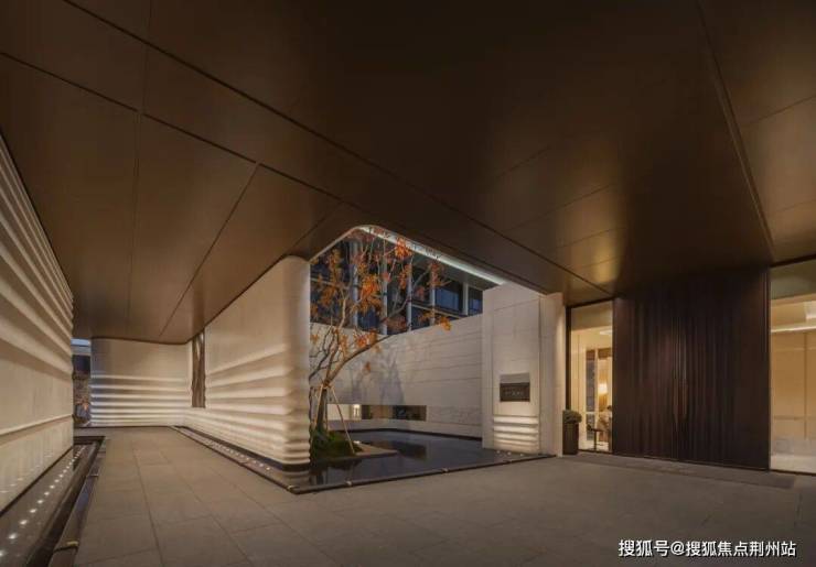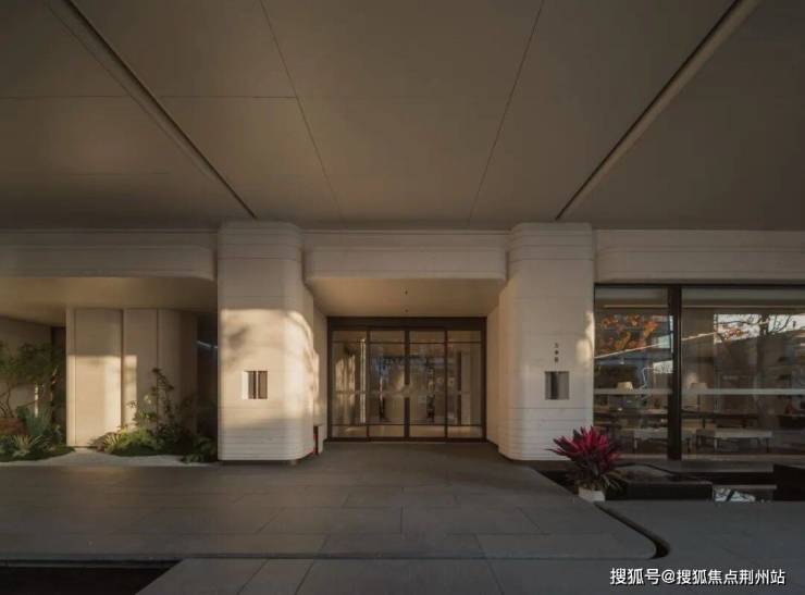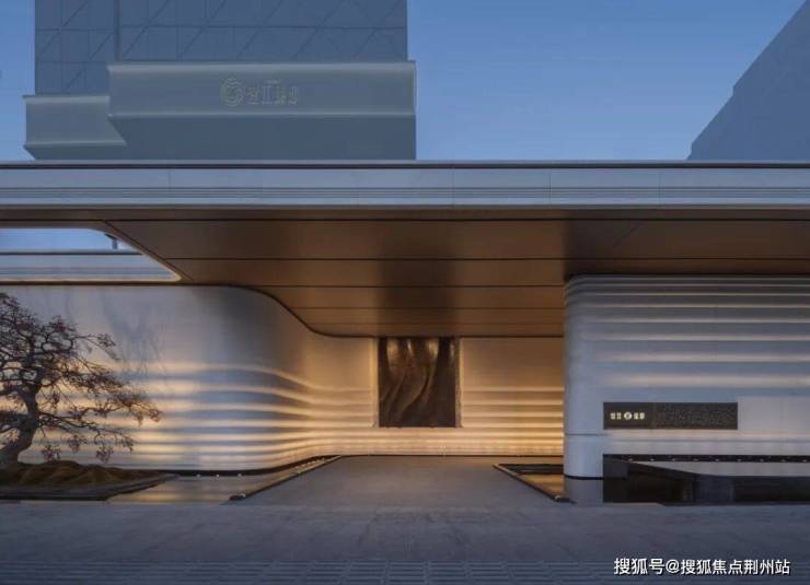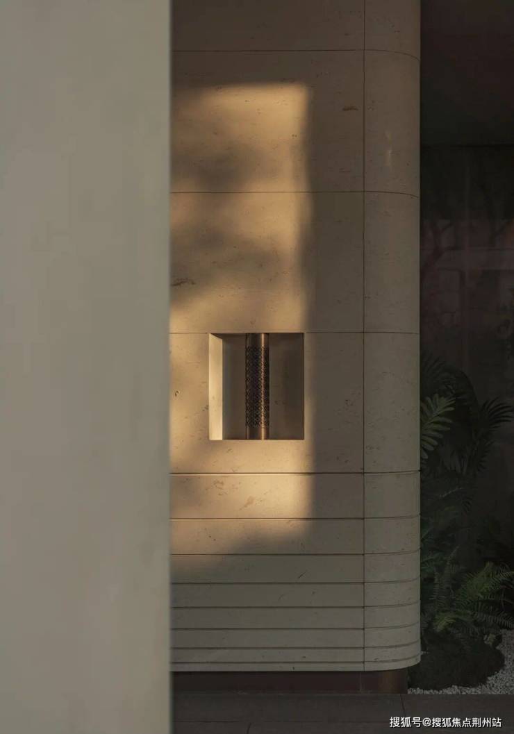部分楼栋建筑底部采用约6.2米挑高架空层,底部空间完全打开,形成城市与社区的温柔过渡。弧形语言提取黄浦江水纹,月光米黄石材+"揉石成缎"工艺消解刚性。弧形仿石铝板勾勒立面层次,门厅、柱体皆以柔弧过渡。