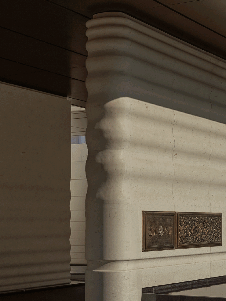 循径深入,一方藏于繁华深处的秘境花园豁然展现。一进序厅以水为主题,以"揉石成缎"的工艺致敬张江人"万川归海,而海不盈"的精神。结合黄浦江波浪水纹的意象进行抽象提炼,锻造石材,形成褶皱的肌理,打造富有变化的温润表情。