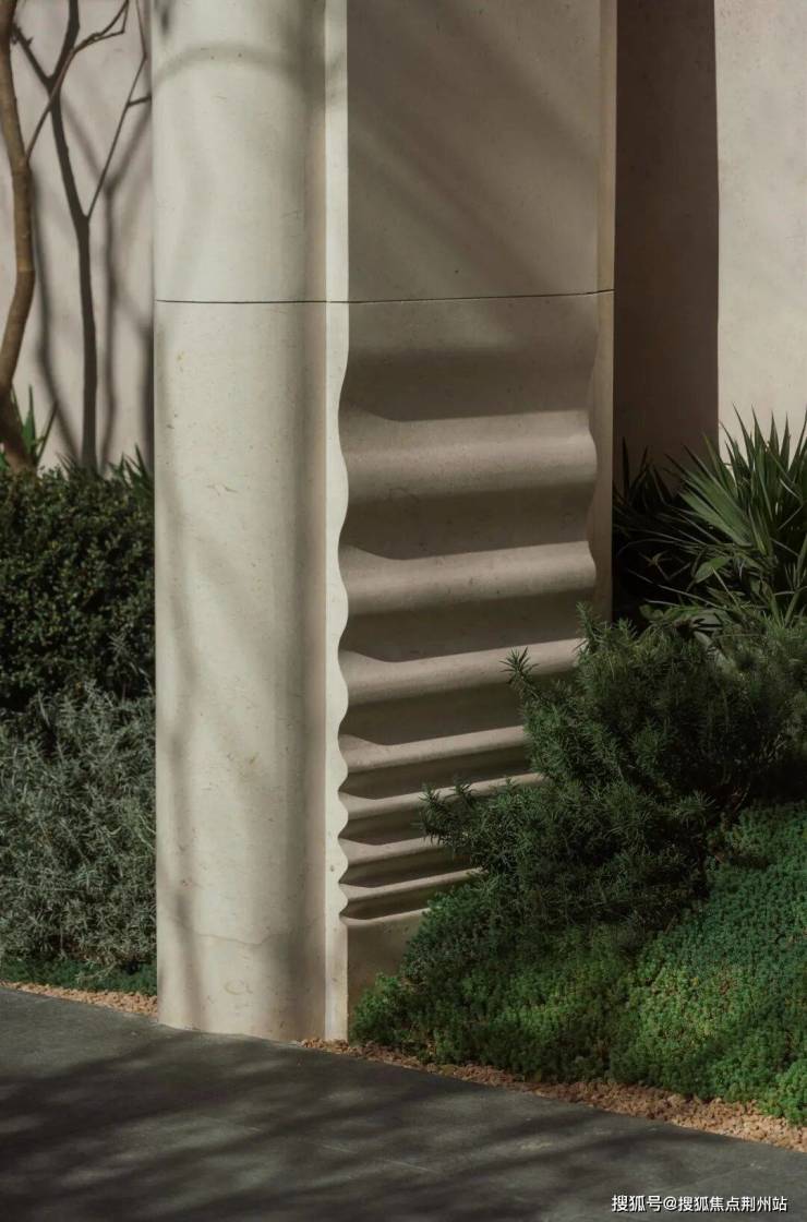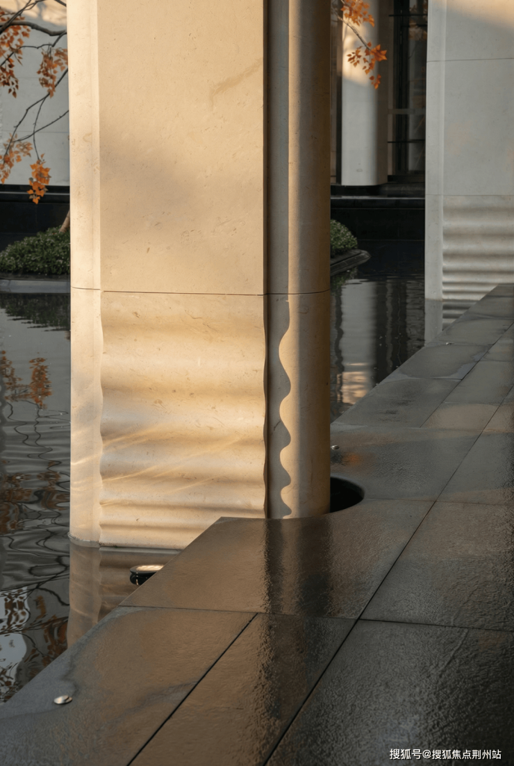 圆弧处理的石材立柱严格阵列,形成天然的风景画框,将光影、水景、树影框定成画。这种几何秩序让人想起康的经典语录:"建筑是深思熟虑的空间创造。"