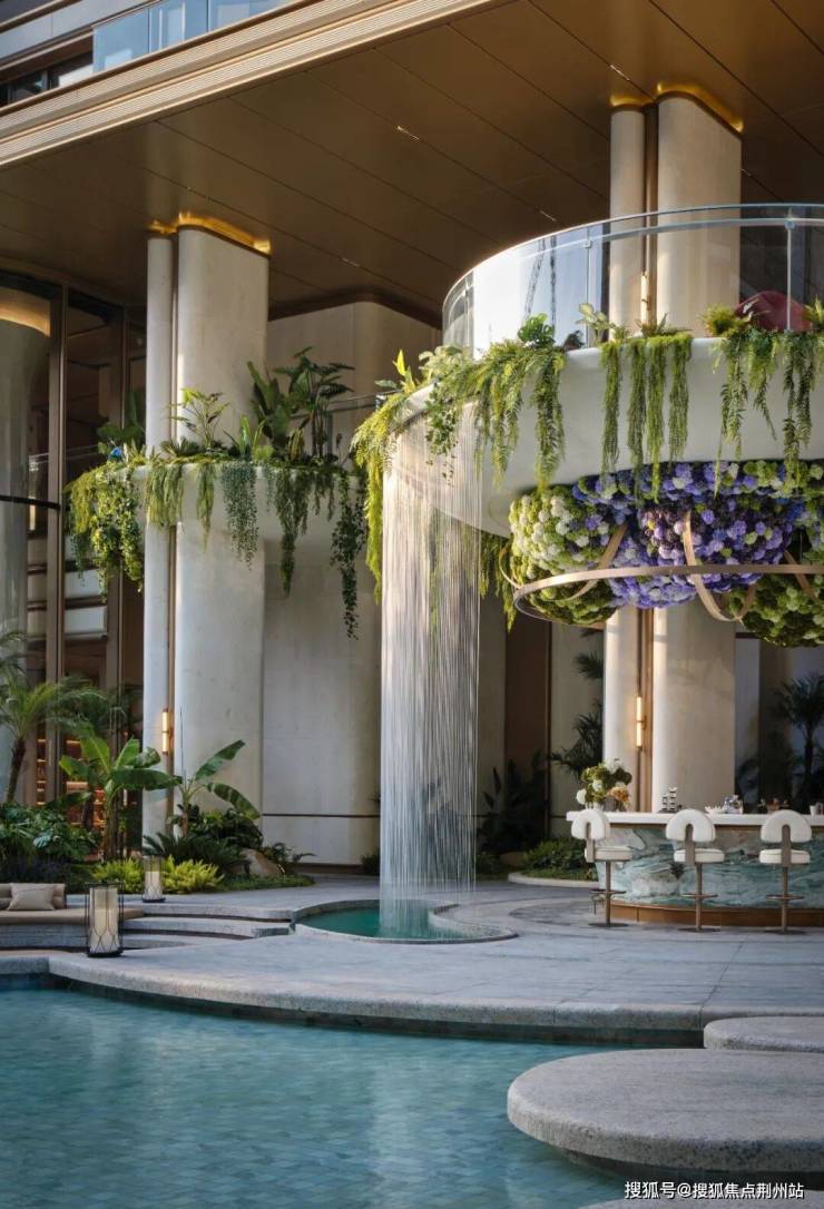 有了桥,还得有水。中国铁建·西派云间做了一座约1600㎡的垂直瀑布水院。