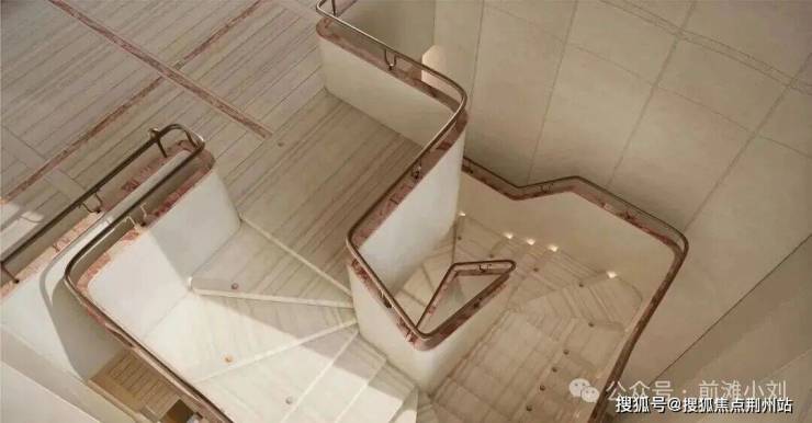 艺术旋转楼梯进入,整块白木纹石材切割+宝格丽粉镶边设计的旋转楼梯,营造社区高雅氛围,步步生花。