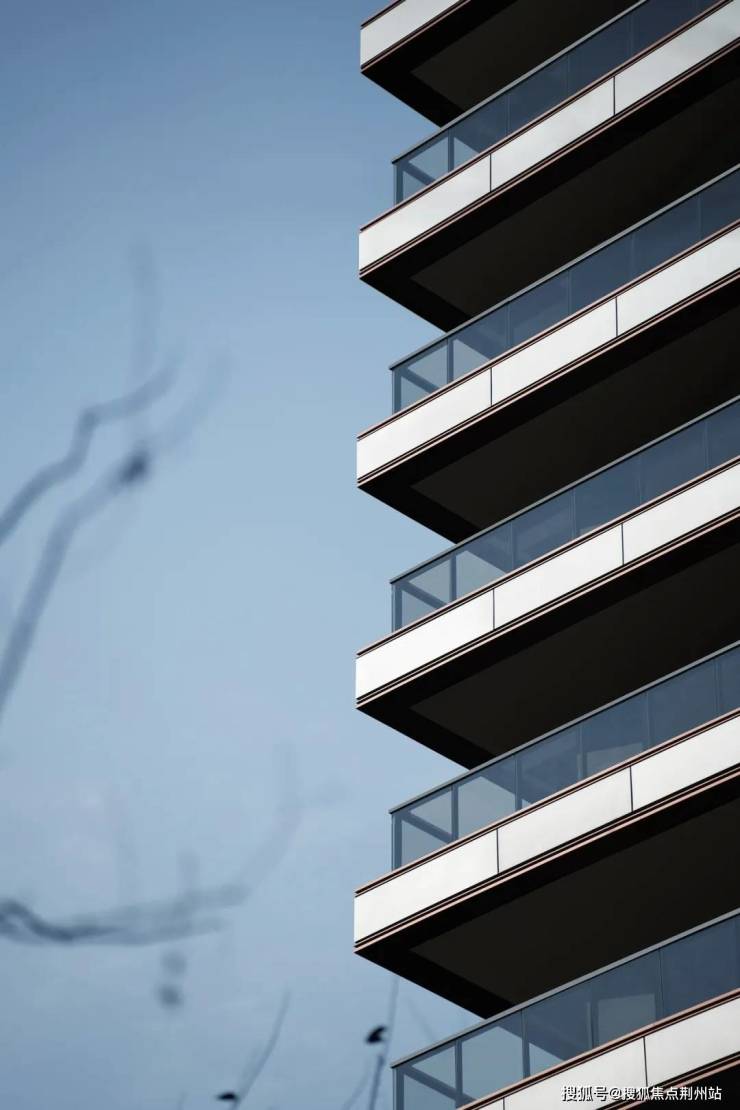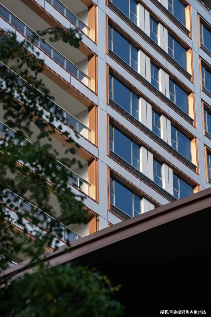 细节上,呈现出独具一格的丰富层次,阳台3层暖色金属边框,好像“三眼皮”层层递进,增强了建筑的立体感和层次感。