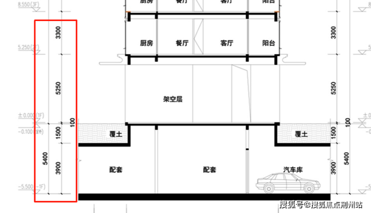 高层房间标准层高3.3米,架空层约5.25米,同时采取了架空平台的设计形式,整体抬高约5.4米,2F住宅整体架空高度约10.6米。