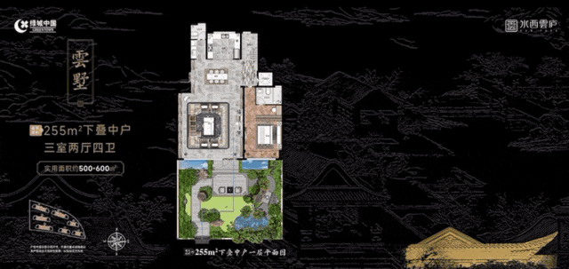 如果说归家礼序以层层递进的私密感构建内向场域,中央景观则以开放姿态铺展出一副山水长卷。