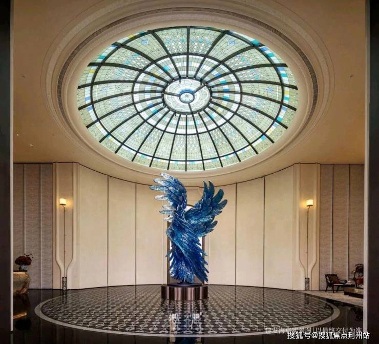 9米挑高大堂,致敬和平饭店经典风范,彩玻穹顶引天光入境,光影流转。中央屹立百羽栖澜艺术雕塑,象征尊贵与祥瑞。芦海宸韵非遗绣作,融汇五大非遗技艺,以针为笔,绣出海派归家的格调与雅韵。