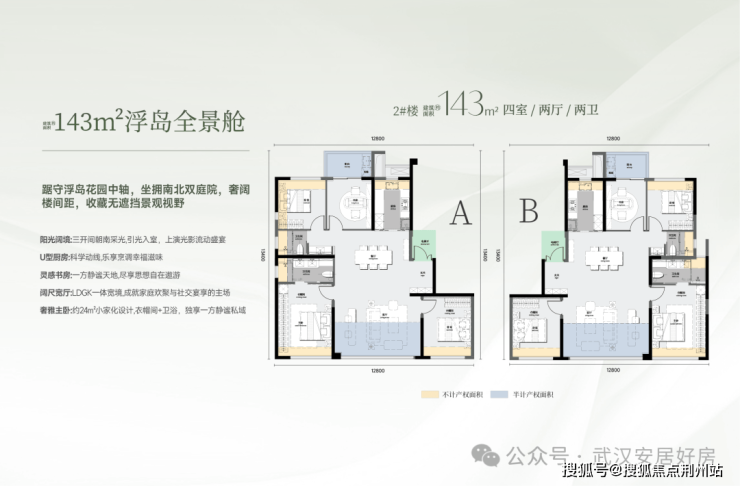 建面约143m²4房2厅2卫户型,采用LDK(客厅、餐厅、厨房)一体化设计,形成开阔流畅的家庭核心区,采用4房全明设计,北向次卧带阳台,通风与采光条件较好。厨房采用高效的U型布局,动线较科学。主卧约24m²采用套房设计,在强调居住私密性的同时,兼顾尺度感与功能性,满足改善型客群的品质生活需求。