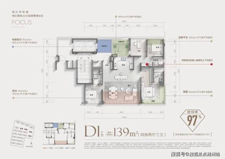 来看,君潮润府高层里面最大的139平 — 4+1房(双套房)2厅3卫的户型,怎么把实用空间变大的。