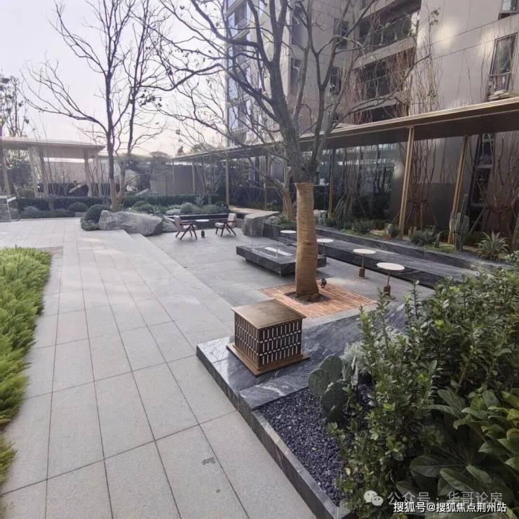 这边是一片台地花园,种植了随季节变化的各种树木,据售楼部介绍,有90年树龄的广东铁冬青、价值50万元的造型羽毛枫、乌桕树,据说这是一棵600年树龄的西班牙油橄榄。