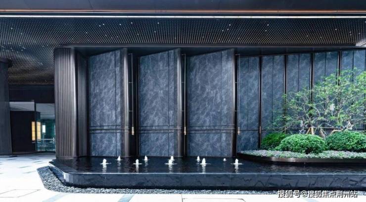 首层单元大堂与风雨连廊的设计风格和谐统一,运用仿石砖镶嵌金属条的设计手法,在电动门两侧布置发光云石灯柱,并在顶部吊顶安装星光顶,既提升了场域特性,又增强了昭示性。议事厅两侧结合单元入口,分别布置了两个小巧精致的庭院,加之景观水帘和金属网帘的搭配,为入口和架空层营造出更多自由与愉悦的氛围。