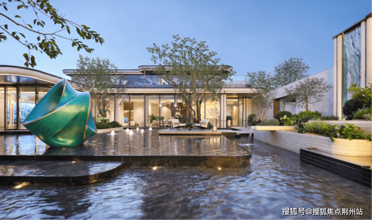 约7米高的主入口,把贝金米黄石材、维多利亚绿等名贵石材,与古铜色金属板、紫薇等名贵草木巧妙搭配、相得益彰,犹如穿着翠绿华服的翩翩公子,透着一身贵气。