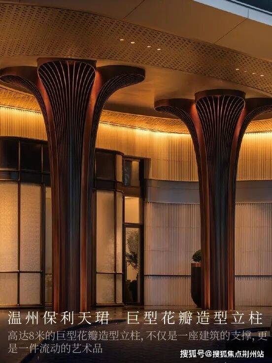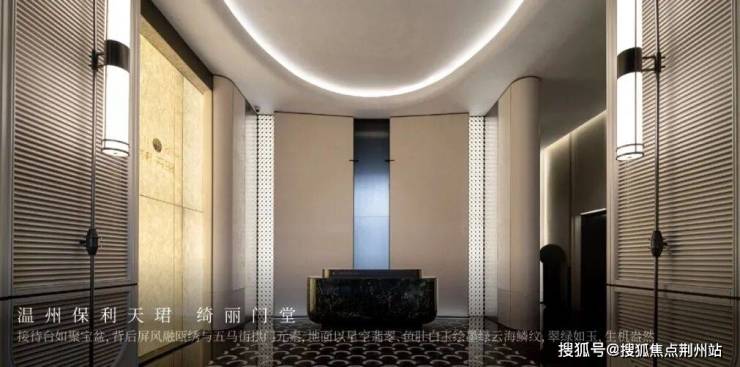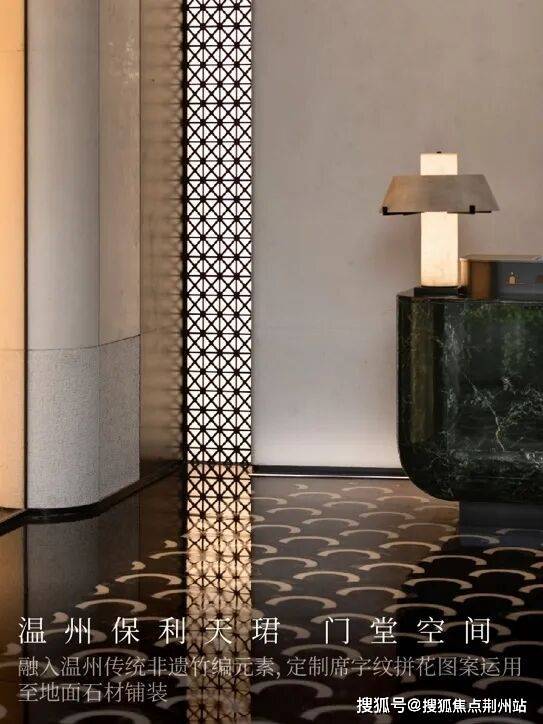 在温州,保利天珺接待台如聚宝盆,屏风融瓯绣与五马街拱门元素,地面以星空翡翠、鱼肚白玉绘墨绿云海麟纹,翠绿如玉,生机盎然。