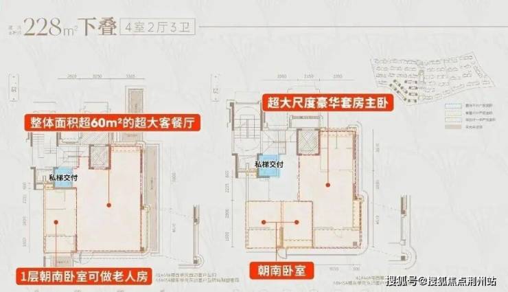 ①建面约228㎡下叠户型详细分析: