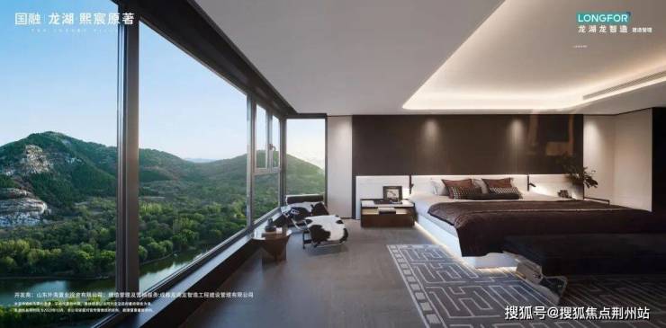 二楼行政主卧套房,包含独立卫生间、衣帽间、观景阳台,通过巨幕屏直面腊山,业主的体面感照顾得无以复加。