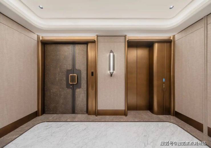 类一梯一户的电梯厅,格局方正大气,尽显私密和尊贵调性。米黄色木纹金属板墙面、大理石通铺地面以及厚重的装甲门,从入户开始,就将“奢华”二字武装到了牙齿。
