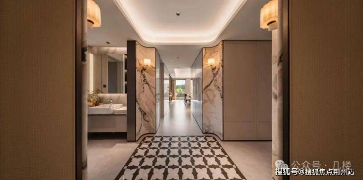 入户玄关采用极具仪式感的“十字玄关”+石材拼花设计,搭配75*150的大规格灰色瓷砖,进门后有双排的玄关柜,收纳空间非常充足,功能性也非常强。另外两侧设有壁龛,壁龛内墙面材质为安第斯雪景岩板,典雅大气。