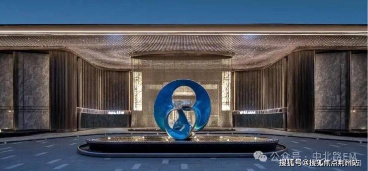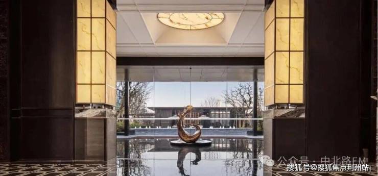 第二境·超宽领域归家大堂:以宝格丽酒店为灵感,采用灰色石材搭配暗金色金属装饰,两侧涌泉水景引导至约 52mX7m 高奢定制门厅。入口处艺术雕塑凝练“江湖气质”,垂落的金属帘营造光影交错的朦胧美感,如同穿越奢华酒店的专属门廊。