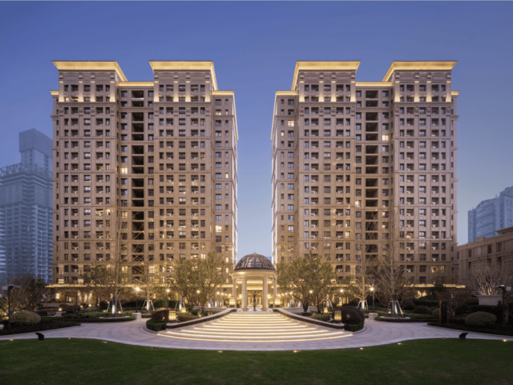 甄选沙特阿拉伯宝金石作为建筑外立面,以繁复的工艺与工序,力求传承百年、隽永建筑沉稳、高贵的格调。 融创•外滩壹号院由6栋正统大宅点状排布,呈现出一个端正的 “王”字布局,以百余米中央景观大道为轴,并形成围合式花园,使景观氛围充满着皇家仪式感。