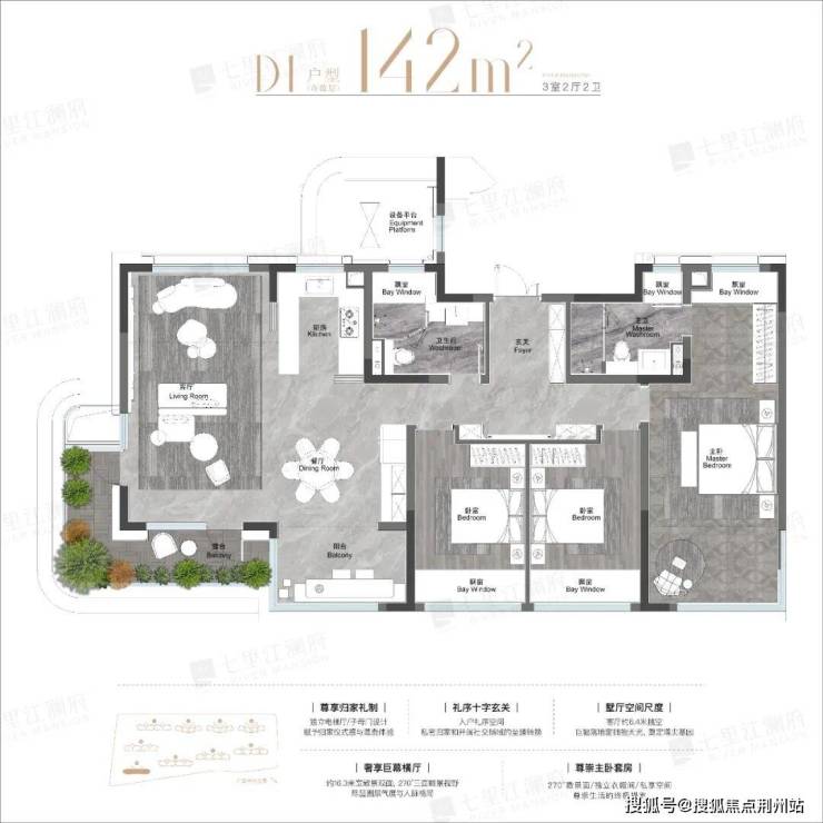 主卧大套间,带有独立卫生间,270°观景面,比起102㎡改善尺度更大。露台做了主卧空中花园,不占用阳台的独立功能。