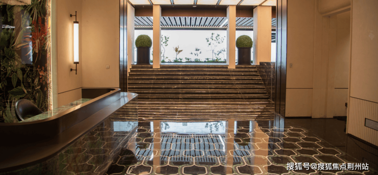 两侧矗立数十年树龄的罗汉松与丛生朴树,门厅中央仿佛漂浮于水中的艺术雕塑“樾影昆仑”,让你由门而入,便完成了都市繁华与居家静谧的悄然转场。