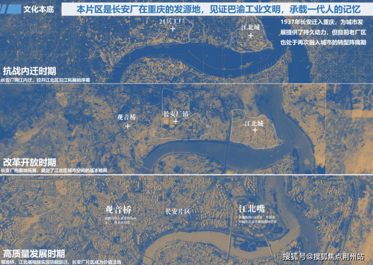 首先从区位来说,项目左手观音桥,右手江北嘴,正对大礼堂。是江北乃至重庆核心区最后的留白之地,属于长安三工厂城市更新的一部分。1937年,长安厂溯江内迁进入重庆,这里就是21兵工厂的所在地。