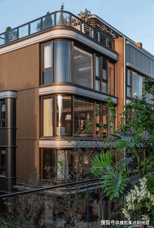 建筑设计:采用现代简约美学风格,立面以巴西进口亚马逊绿奢石、弧形玻璃和铝板组合,搭配香槟金属线条、威斯康白石材等,兼具颜值与质感,部分户型采用弧形转角全景窗,实现270°无界视野。