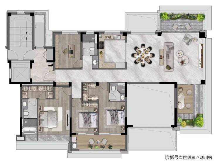 休憩区则采用四房三卫双套房设计,主卧配置奢华堪比星级酒店,两间次卧均南连大阳台,充分保障每位家庭成员的空间舒适度与景观享有度。