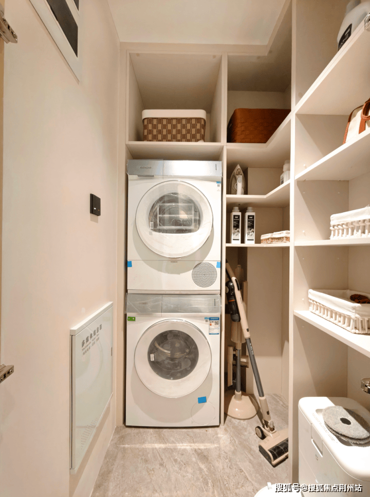 类一梯一户的设计,门口带有一个巨大的电梯厅空间,业主可以利用成为收纳空间。入户后,是一个独立玄关+800库设计,让业主常用物品(洗衣机、清洁工具等)有了绝佳的放置位置。