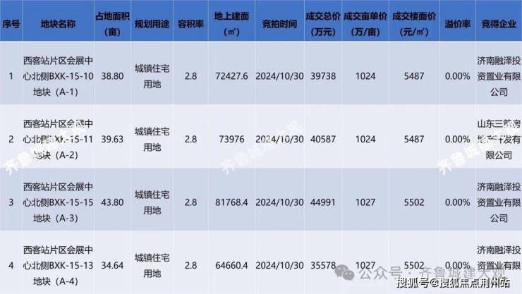 A1地块位于西客站片区国际会展中心北侧,占地38.8亩,容积率2.8,2024年10月30日由城建集团旗下济南融泽投资置业有限公司底价摘牌,成交楼面价5487元/㎡;当天,城建集团还摘牌东侧的A3、A4两宗地块,三箭摘牌A2地块。4月份,城建三宗地块招标确定由华润进行代建。