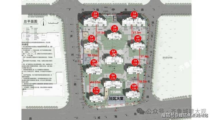 城峯天萃A1地块规划2栋26层高层、9栋17层小高,楼间距37-45米,约有26套居住公寓。项目较周边路网抬高约0.6-2.6米;沿威海路设置社区大堂,结合下沉庭院,打造小区会所;地下车位配比为1:1.12,规划97个地下车位;1、2号楼设置地下非机动车库,小区外围沿用地红线设置地上非机动车位。