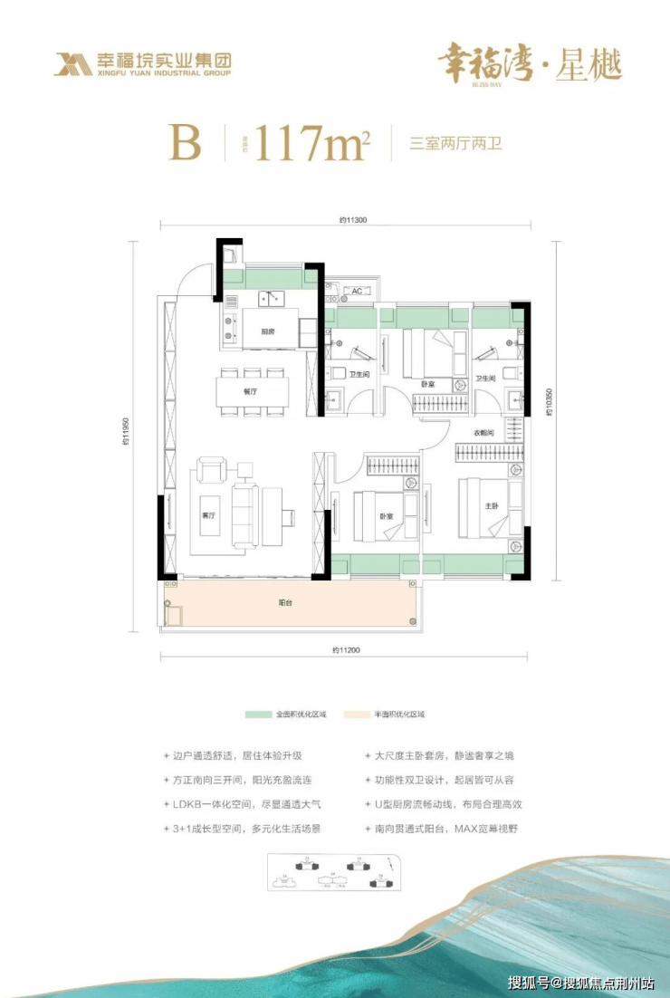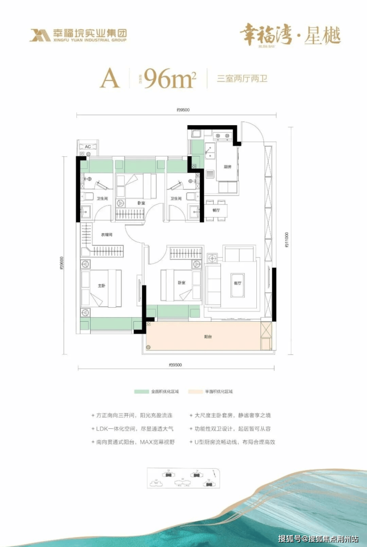 1、优化后空间使用率最高约97%;2、方正南向三开间;3、LDKB一体化空间;4、南向贯通式阳台;5、大尺度主卧套房;6、功能性双卫设计;7、U型厨房流畅动线。