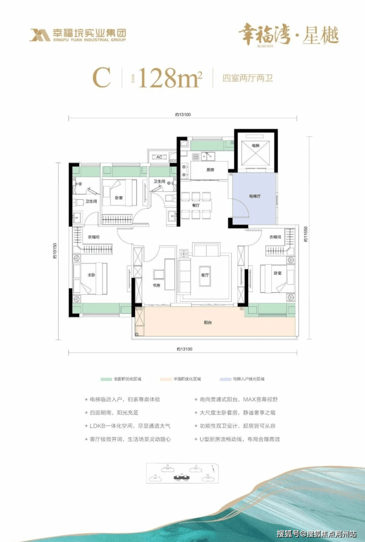 1、优化后空间使用率最高约94%;2、整层全部为128㎡户型,圈层纯粹;3、电梯临近入户,电梯厅前室无其他住户共享;4、四面宽朝南;5、LDKB一体化空间;6、大尺度主卧套房;7、南向贯通式阳台;8、L型厨房流畅动线;9、功能性双卫设计。
