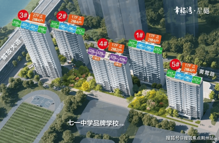 楼层、梯户比:1、2、4、5#17层,1、2、5#两梯四户,3米层高;4#两梯两户,两个单元,3米层高;3#27层,两梯四户,2.9m层高;