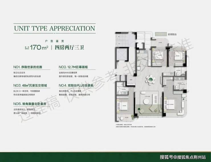 ❶高层建面约170㎡户型:4房2厅3卫,类一梯一户,设有独立电梯厅,含赠送得房率约88%左右。