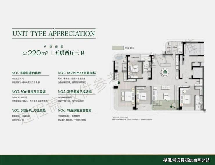 ❷高层建面约220㎡户型:5房2厅3卫,南向面宽近18.7米,类一梯一户,设有独立电梯厅,含赠送得房率约91%左右。