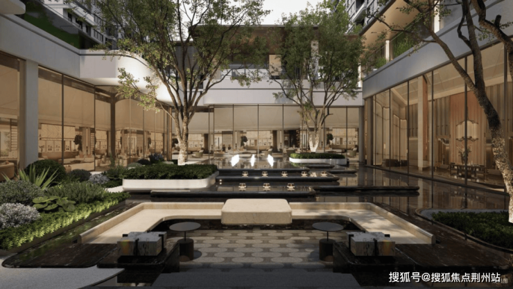 仪式系统:酒店式奢阔大门,定制紫薇雕塑在水中盛放,浅色石材与高质金属交相辉映,奠定名门归家之仪;风雨连廊串联归家动线,将日常淬炼成一段充满仪式感的心灵旅程;地库入口感应灯带,一路星光璀璨,拓领归家的奢华排场。