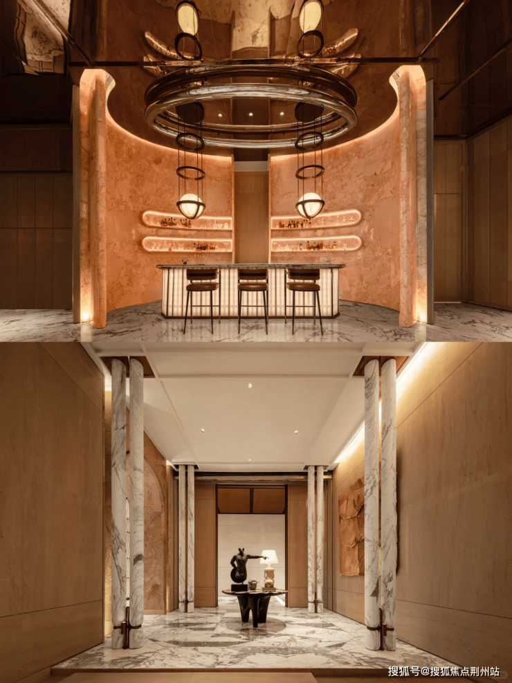 以“湖滨度假生活”为核心,示范区精心打造的公共区域及会所室内设计,灵感源于“水之形态,马之精神”,巧妙融合湖滨文化与现代艺术元素,营造出高端奢华度假酒店的轻松与惬意。选用烟粉色大理石材、流畅的弧形线条、温暖的木质墙面,辅以华美的大理石装饰,共同描绘出水的灵动与韵律。巧妙融入“马之精神”,通过白马雕塑与马主题的油画作品等元素,巧妙呼应,贯穿整个空间。这不仅为项目打造了独特的记忆标识,更与白马湖的意境相得益彰,共同营造出一种宁静与和谐的氛围。