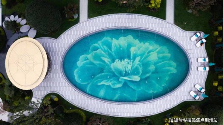 浩运府的主入口横贯约80米,由六扇曲面墙体构成,外挂大面积维多利亚白奢石,非常大气。小区的庭院的设计理念来自于京都安缦酒店,叠水、长桥营造出静谧的氛围。园区的水系从苏梅岛度假酒店汲取灵感,配合亲水卡座、棕榈树,呈现出度假风情。